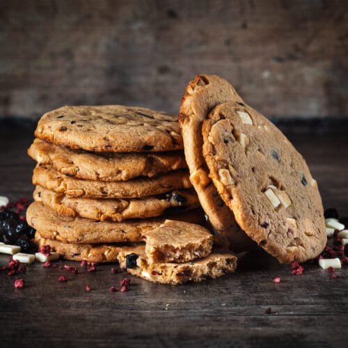 Fortified Wheat Flour [Wheat Flour, Calcium Carbonate, Iron, Niacin (B3), Thiamin (B1)], Belgian Dark Chocolate Chunks (17%) [Sugar, Cocoa Mass, Cocoa Butter, Emulsifier (Soya Lecithins), Flavouring], Belgian White Chocolate Chunks (17%) [Sugar, Cocoa Butter, Whole Milk Powder, Emulsifier (Soya Lecithins), Flavouring], Sugar, Palm Oil, Rapeseed Oil, Fat-Reduced Cocoa Powder (4%), Invert Sugar Syrup, Maltodextrin, Water, Salted Butter [Butter (Milk), Salt], Whey Powder (Milk), Coconut Oil, Raising Agents (Sodium Carbonates, Diphosphates), Flavourings, Molasses, Emulsifier (Mono- and Diglycerides of Fatty Acids)