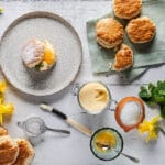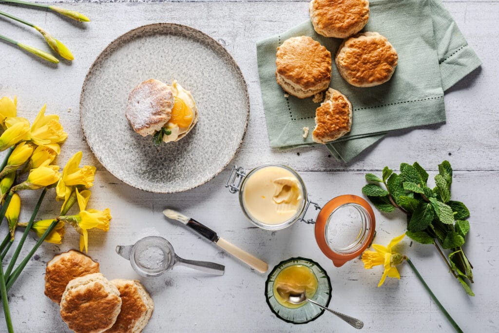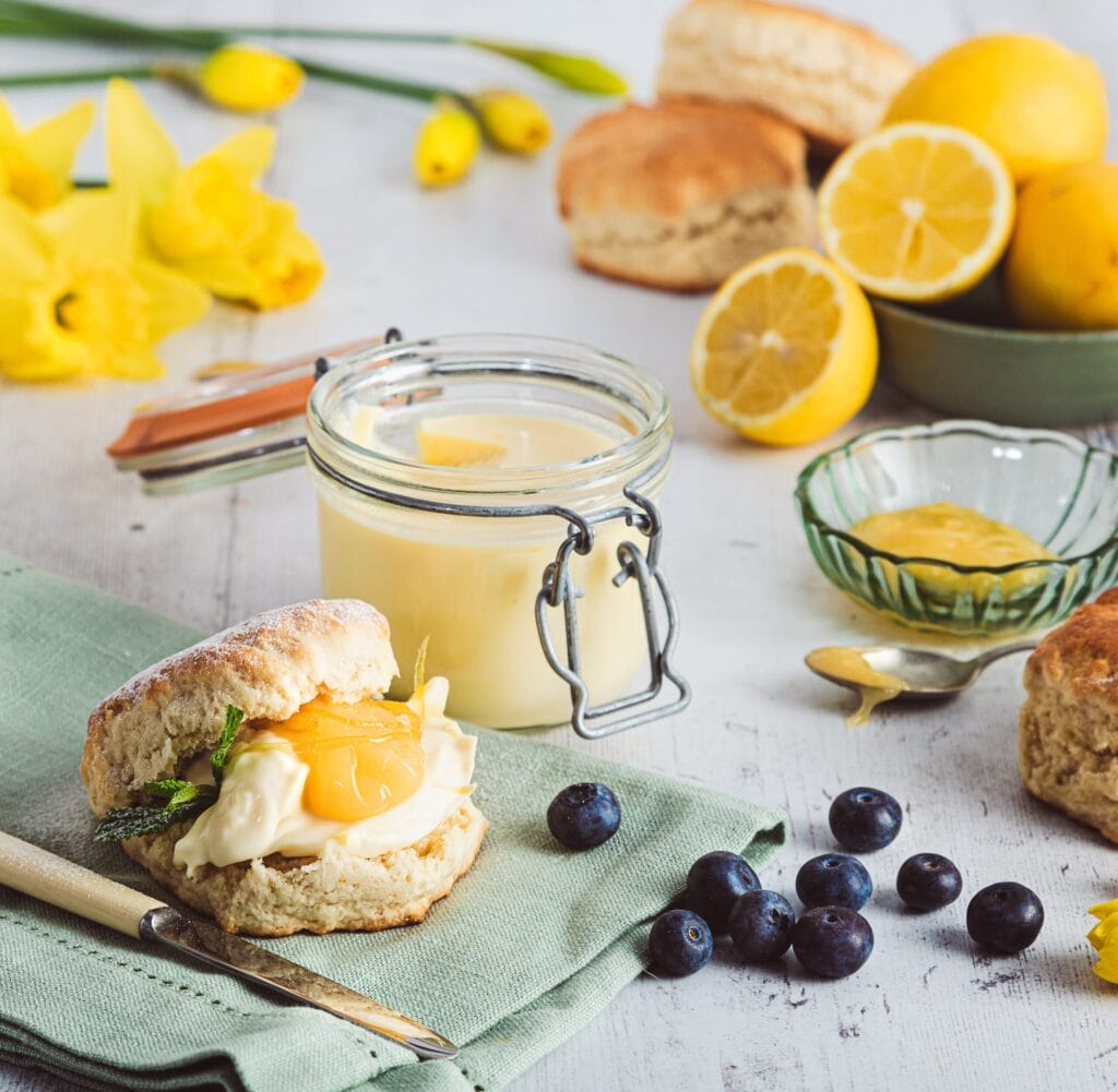 Wheat flour (wheat flour, calcium carbonate, iron, niacin, thiamin), sugar, unsalted butter (milk), Cornish buttermilk, candied lemon peel (7%) (lemon peel, sugar, glucose-fructose syrup, acidity regulator (citric acid)), lemon curd (5%) (sugar, unsalted butter (milk), lemon juice, pasteurised free range egg yolk, pasteurised free range egg, acidity regulator (citric acid), gelling agent (pectin), lemon oil), lemon peel, Cornish clotted cream (milk), raising agents (disodium diphosphate, sodium hydrogen carbonate), humectant (vegetable glycerol), rice starch, lemon juice from concentrate, lemon oil, shea kernel oil, palm oil (certified sustainable), grape juice, pasteurised free range egg, emulsifier (lecithin)