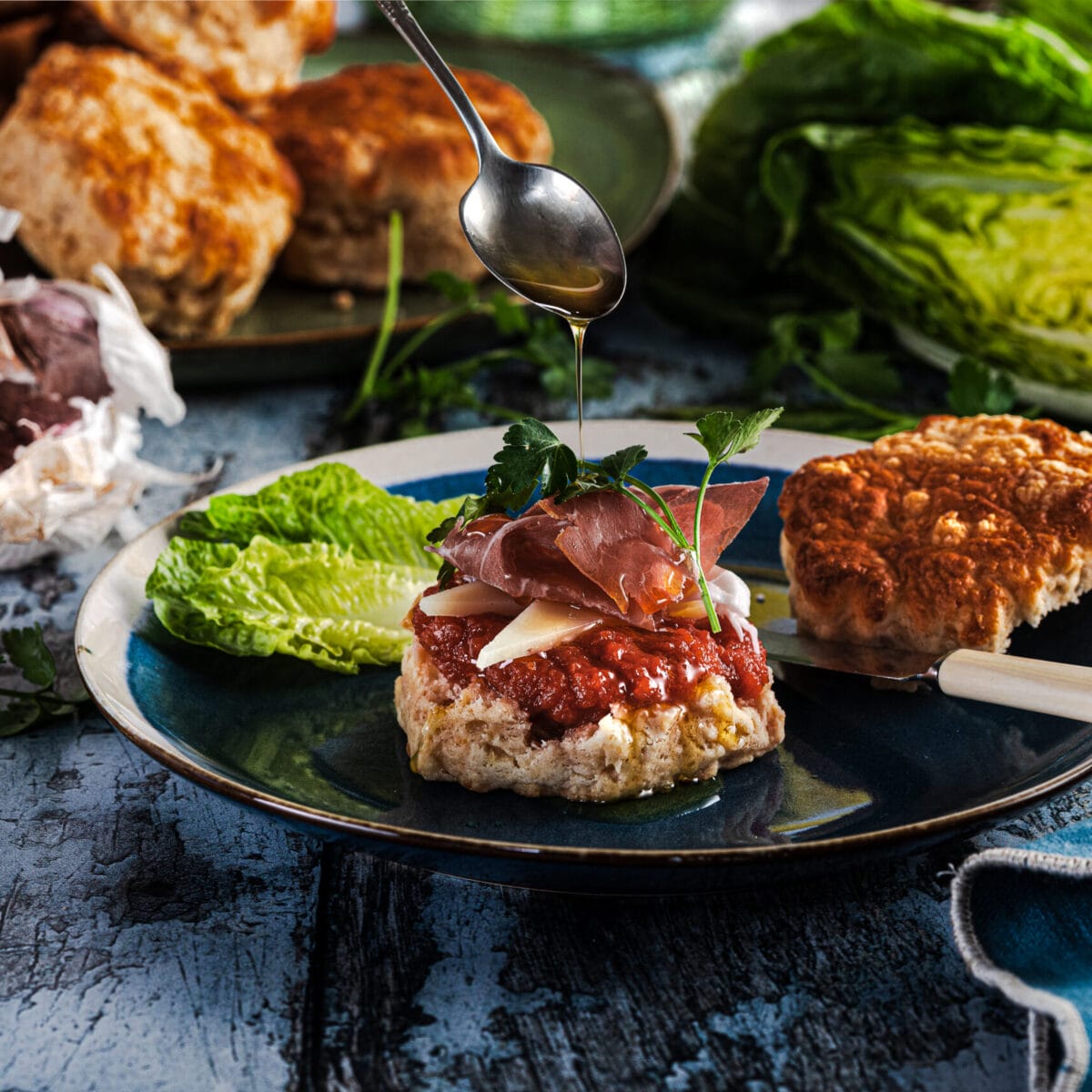 4. Pile the warm tomato pulp onto the scone and top with a slice of nutty Manchego, Prosciutto and a good drizzle of olive oil.